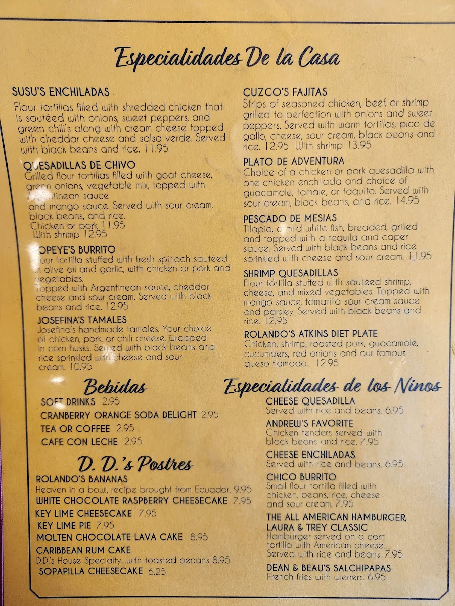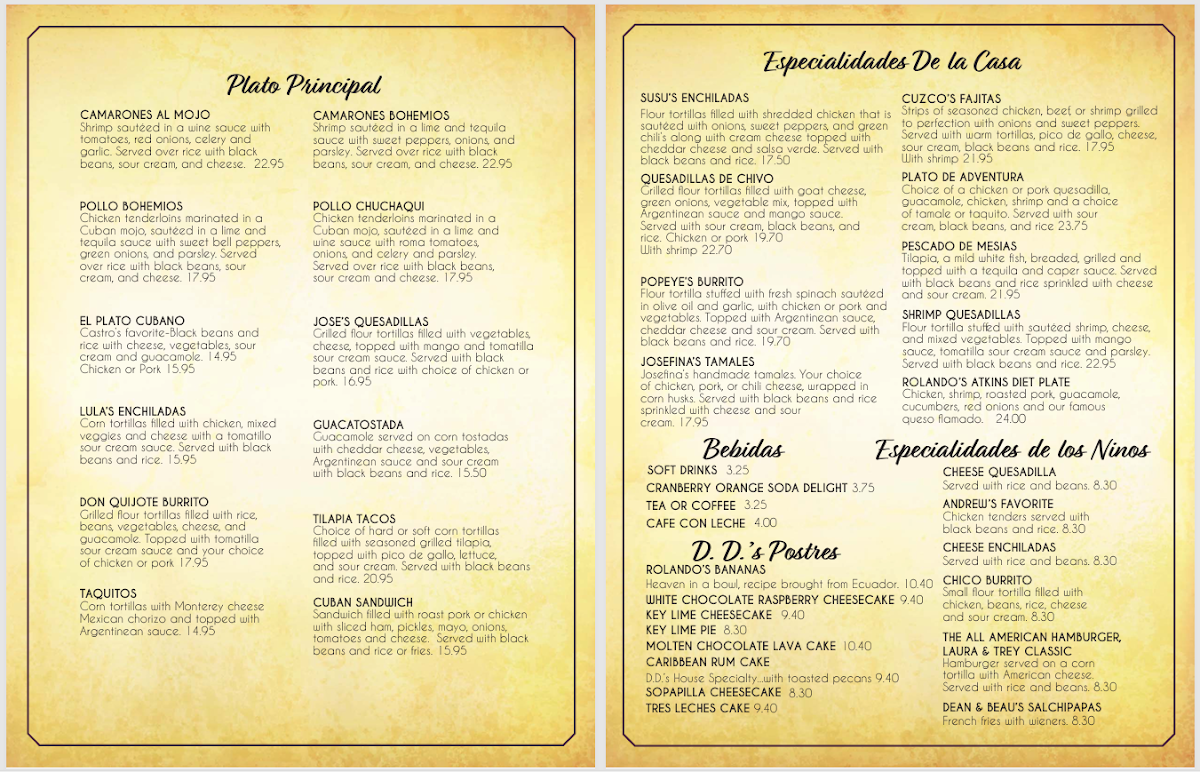 Shrimp sautéed in a lime and tequila sauce with sweet peppers, onions, and parsley. Served over rice with black beans, sour cream, and cheese.