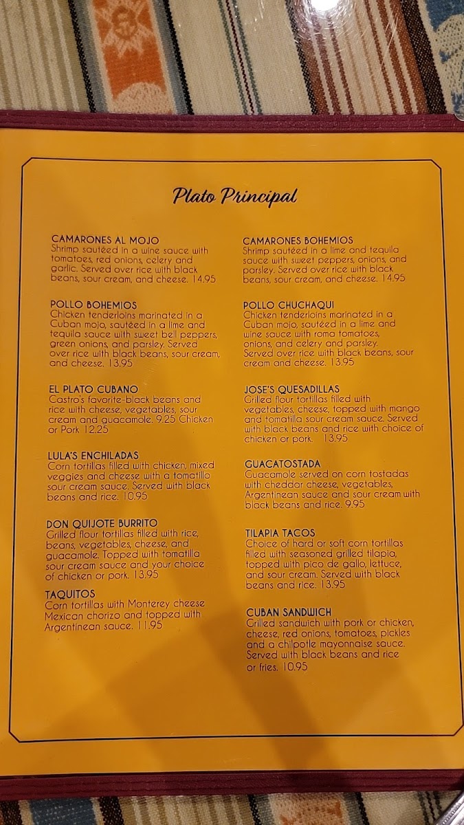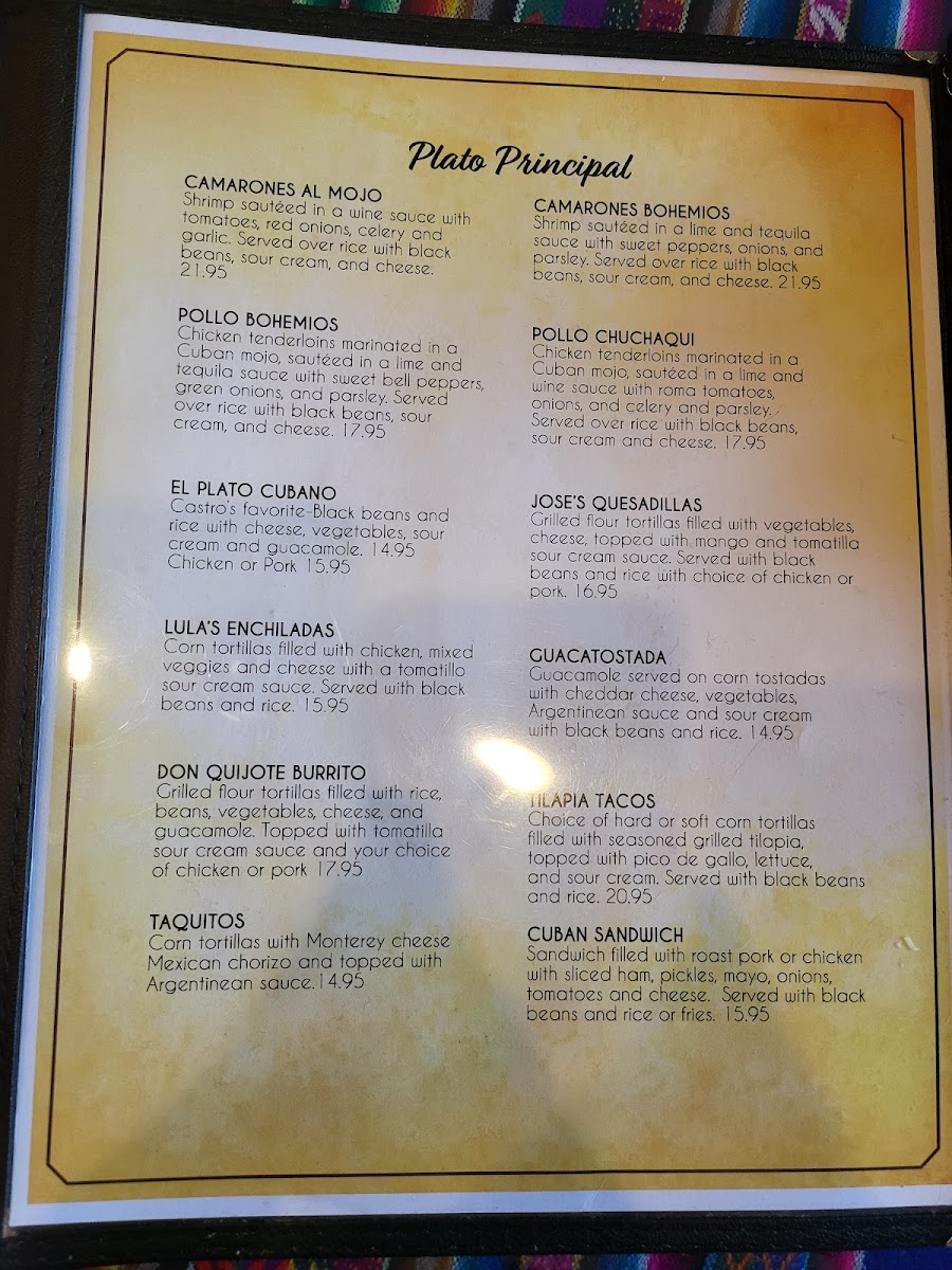 Chicken tenderloins marinated in a Cuban mojo, sautéed in a lime and tequila sauce with sweet bell peppers, green onions, and parsley, and served with rice, black beans, sour cream, and cheese.