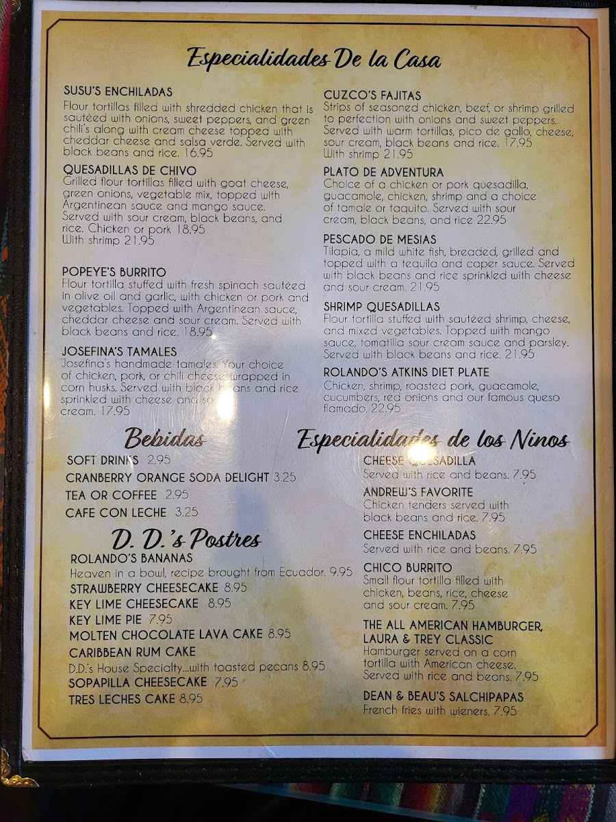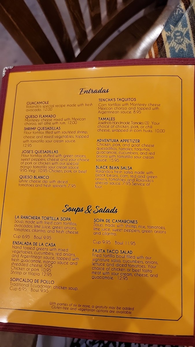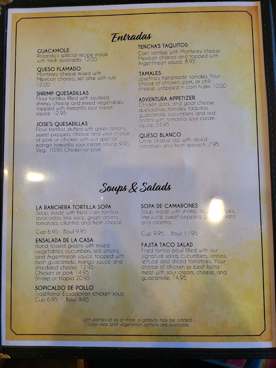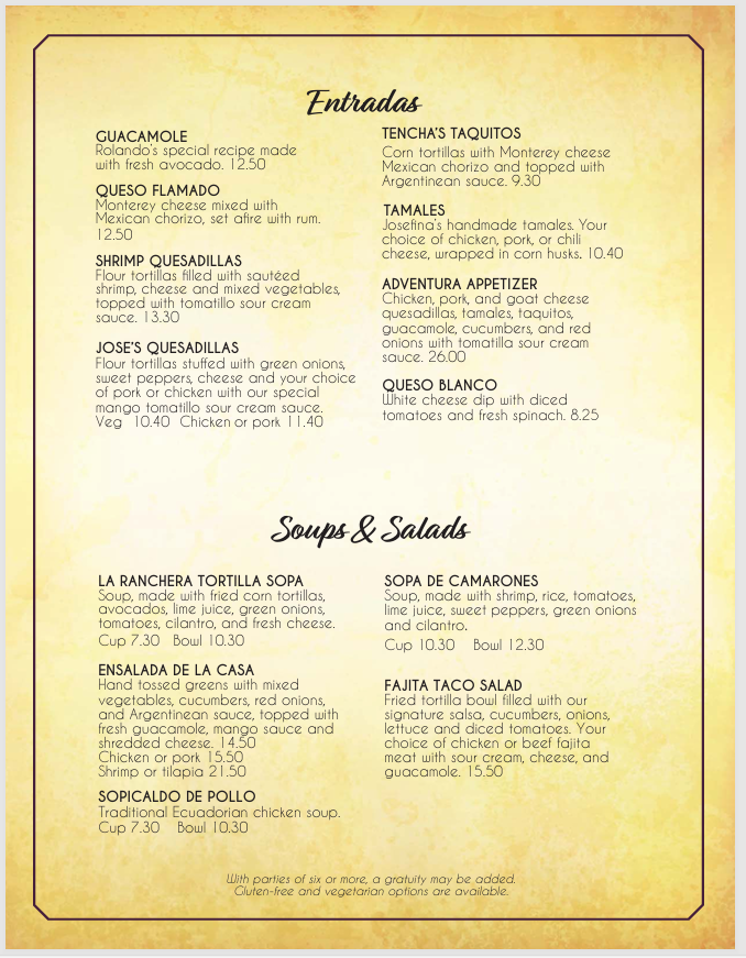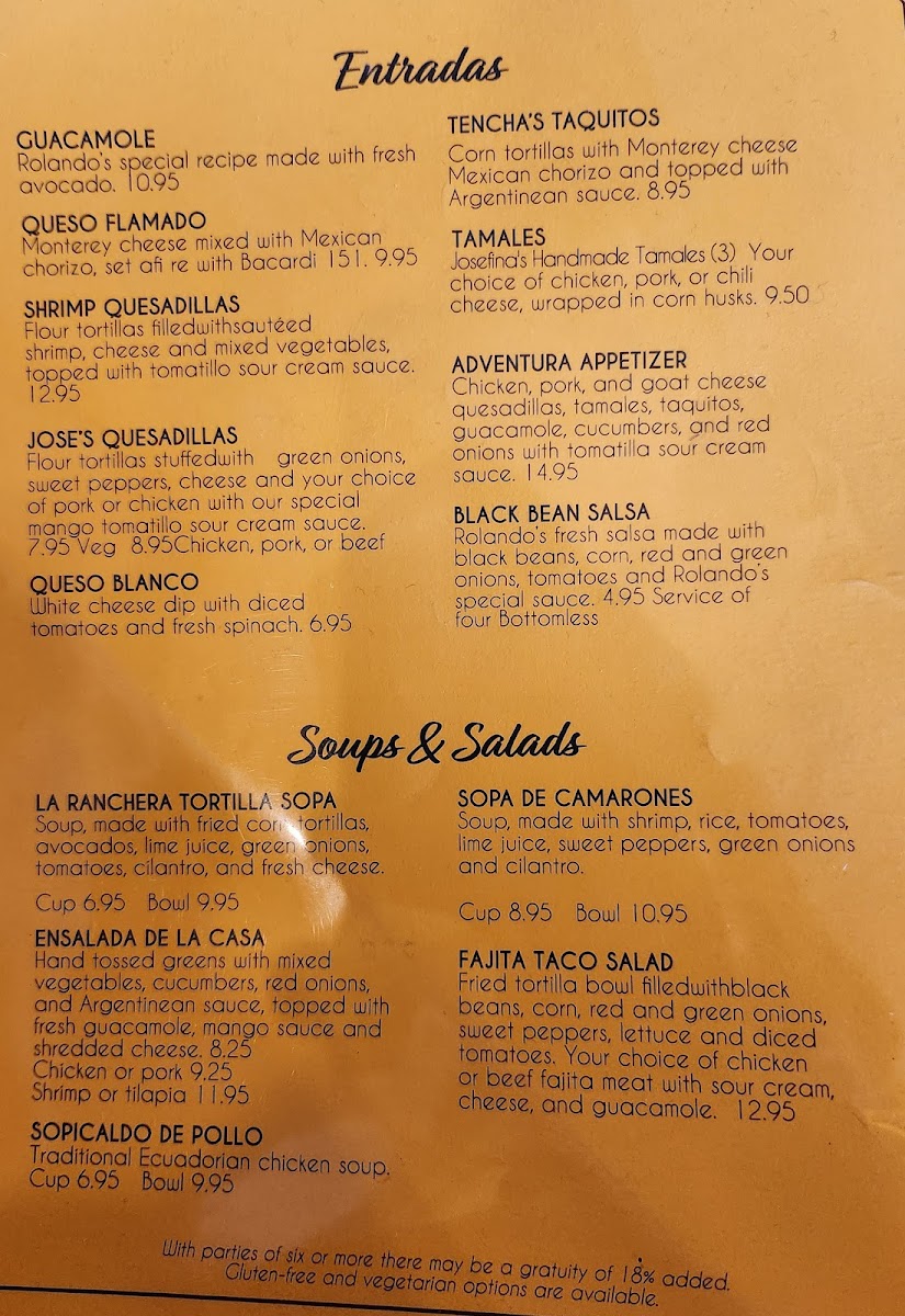 Flour tortilla stuffed with sautéed shrimp, cheese, and mixed vegetables, topped with mango sauce, tomatillo sour cream sauce, and parsley, and served with black beans and rice.